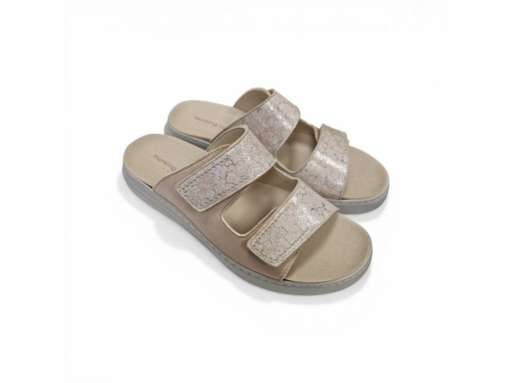 Dámské pantofle Mursing Care v béžové barvě v kombinaci se stříbrnými odlesky. Ortopedická podpora klenby. Syntetický vrchní materiál je lehký, odolný a snadno údržbový, ideální pro každodenní nošení i u citlivějších nohou.