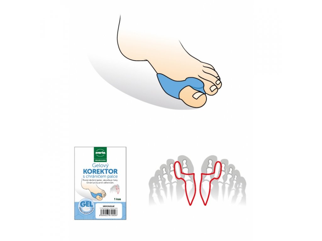 Spojení gelového korektoru s chráničem palce tvoří měkkou a pružnou kombinaci dvou pomůcek. Silikonový gel optimálně absorbuje tlaky, rovná vbočený palec a chrání otlaky na kloubu palce. Výborně fixuje obě spojené pomůcky ve správné poloze.