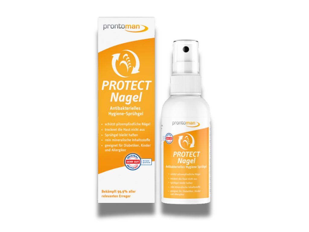 Ochranný gel na nehty ProntoMan je hygienický sprejový gel připravený k použití pro každodenní ošetřování nehtů citlivých na plísně. Čistě minerální sprejový gel na bázi technologie ECA má ideální přilnavost a bezpečně chrání před původci plísní nohou a nehtů. Pokožku a nehty ani při pravidelném používání nevysušuje a po aplikaci se opět rozloží na přírodní výchozí látky vodu a sůl. Krátkodobý pach chlóru při nanášení je známkou aktivity výrobku.
